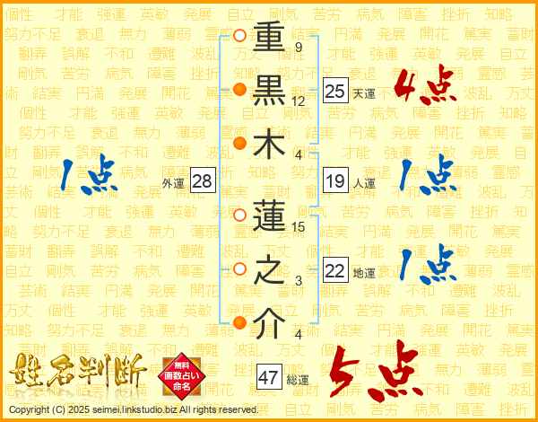 重(9画)黒(12画)木(4画) 蓮(15画)之(3画)介(4画)