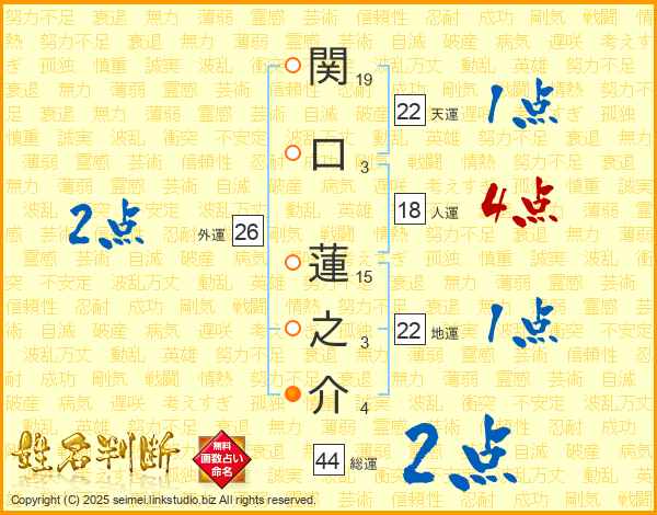 関(19画)口(3画) 蓮(15画)之(3画)介(4画)