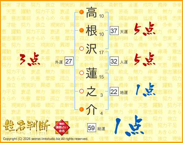 高(10画)根(10画)沢(17画) 蓮(15画)之(3画)介(4画)