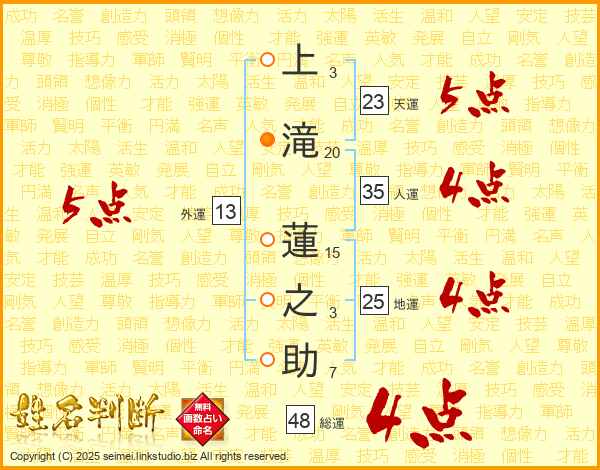 上(3画)滝(20画) 蓮(15画)之(3画)助(7画)