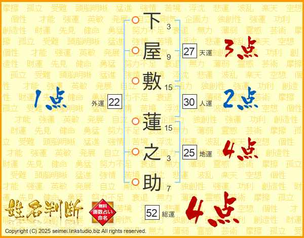 下(3画)屋(9画)敷(15画) 蓮(15画)之(3画)助(7画)