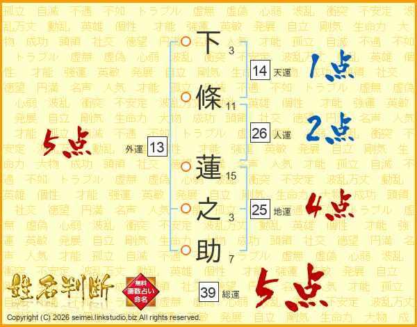 下條蓮之助さんの総運は39画の5点!