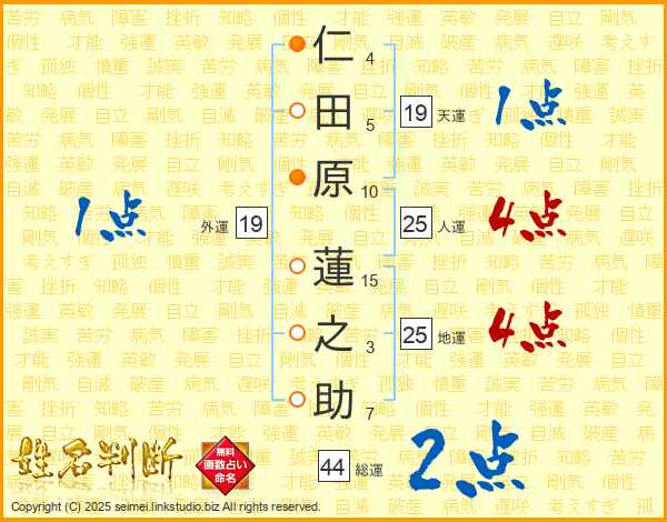 仁(4画)田(5画)原(10画) 蓮(15画)之(3画)助(7画)