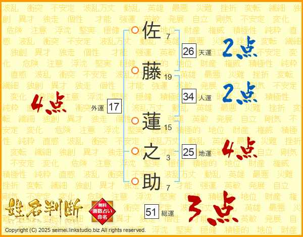佐(7画)藤(19画) 蓮(15画)之(3画)助(7画)