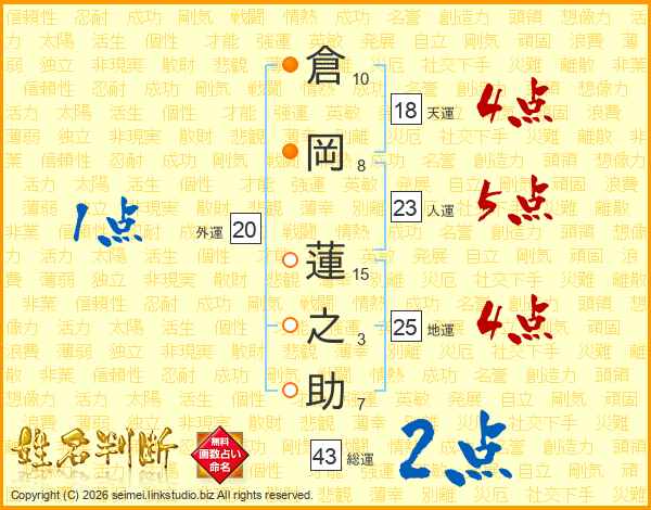 倉(10画)岡(8画) 蓮(15画)之(3画)助(7画)