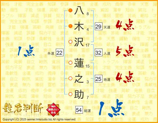 八(8画)木(4画)沢(17画) 蓮(15画)之(3画)助(7画)