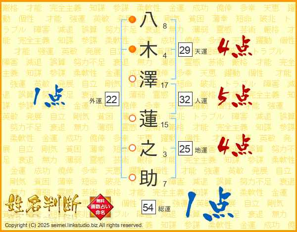 八(8画)木(4画)澤(17画) 蓮(15画)之(3画)助(7画)