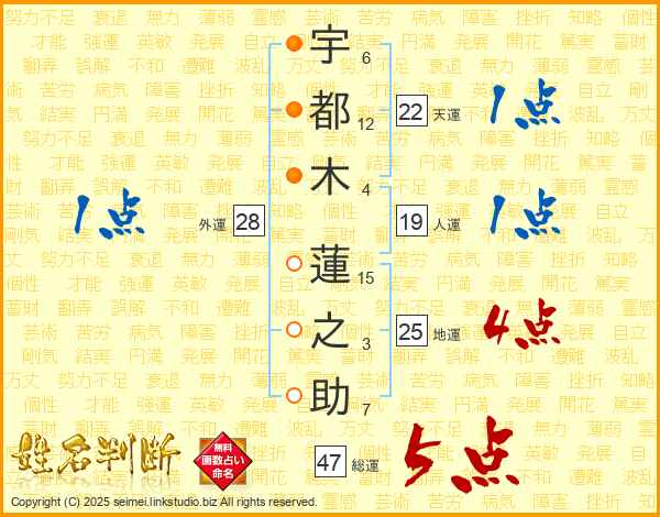 宇(6画)都(12画)木(4画) 蓮(15画)之(3画)助(7画)