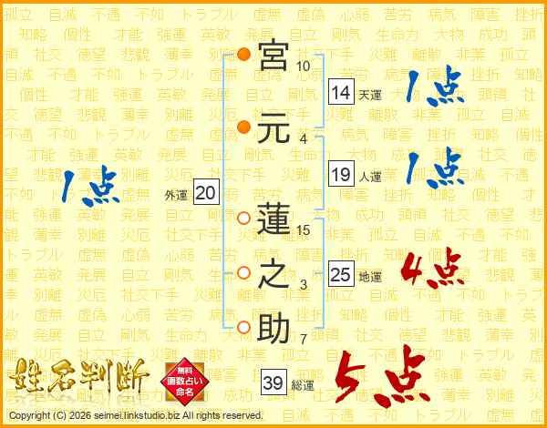 宮(10画)元(4画) 蓮(15画)之(3画)助(7画)