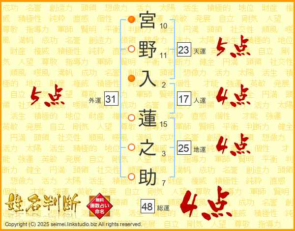 宮(10画)野(11画)入(2画) 蓮(15画)之(3画)助(7画)