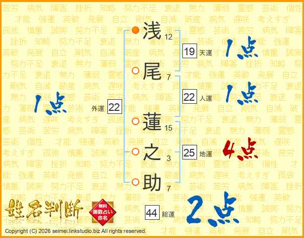 浅(12画)尾(7画) 蓮(15画)之(3画)助(7画)