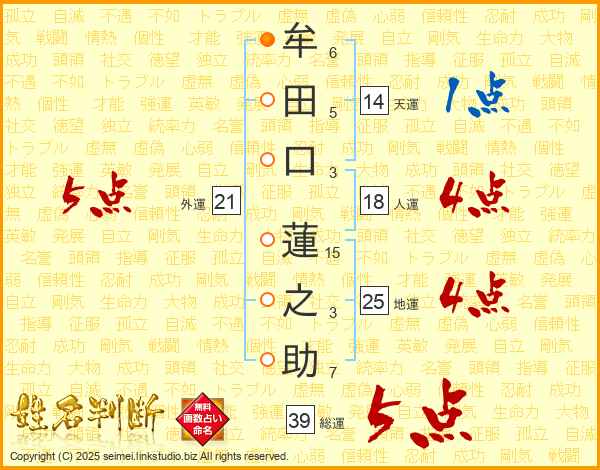 牟(6画)田(5画)口(3画) 蓮(15画)之(3画)助(7画)
