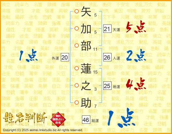矢(5画)加(5画)部(11画) 蓮(15画)之(3画)助(7画)