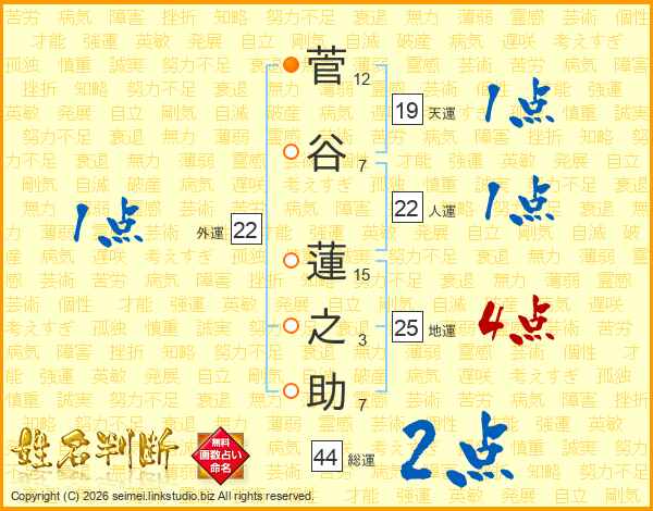 菅(12画)谷(7画) 蓮(15画)之(3画)助(7画)