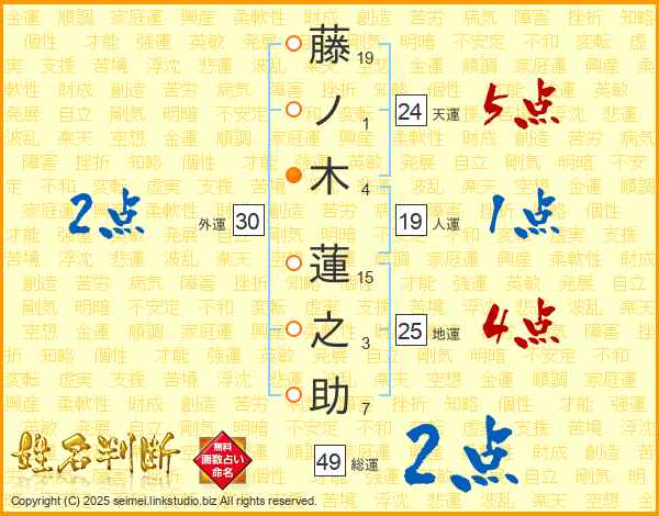 藤(19画)ノ(1画)木(4画) 蓮(15画)之(3画)助(7画)