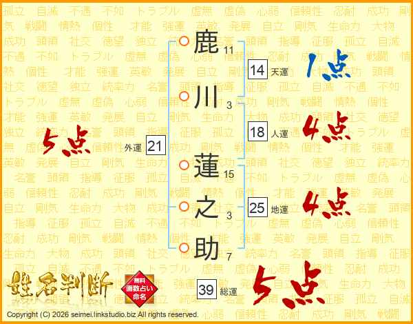 鹿(11画)川(3画) 蓮(15画)之(3画)助(7画)