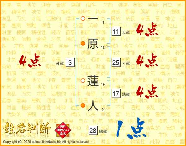 あなたの人生を表す1番重要な運勢です。生涯を通じて影響する総合運となり、主に50歳以降の晩年期に影響を及ぼします。苗字と名前の合計画数。