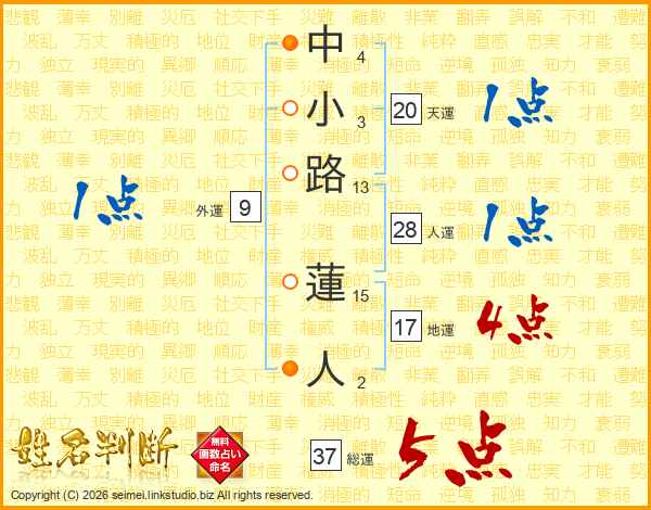 中(4画)小(3画)路(13画) 蓮(15画)人(2画)