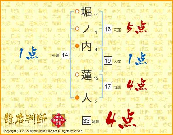堀(11画)ノ(1画)内(4画) 蓮(15画)人(2画)