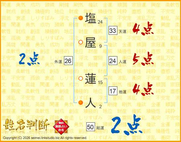 塩(24画)屋(9画) 蓮(15画)人(2画)