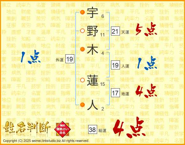 宇(6画)野(11画)木(4画) 蓮(15画)人(2画)