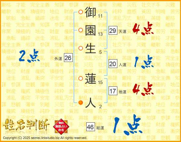 御(11画)園(13画)生(5画) 蓮(15画)人(2画)