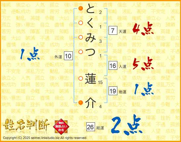 と(2画)く(1画)み(3画)つ(1画) 蓮(15画)介(4画)