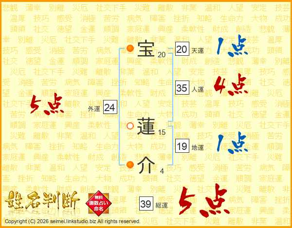 生活面を象徴する運勢です。外部から受ける影響力を表し、結婚運、家庭運や職場、環境への順応性を表します。総運から人運を引いた画数。姓や名が1文字の場合を除く。