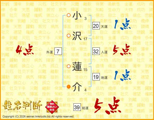 小(3画)沢(17画) 蓮(15画)介(4画)