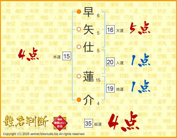 早(6画)矢(5画)仕(5画) 蓮(15画)介(4画)