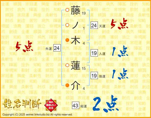 藤(19画)ノ(1画)木(4画) 蓮(15画)介(4画)