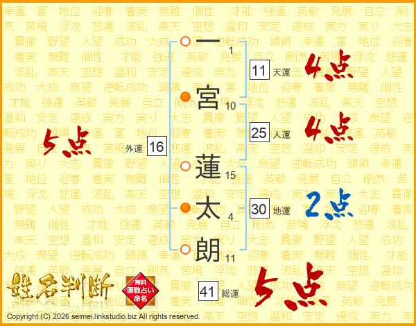 一(1画)宮(10画) 蓮(15画)太(4画)朗(11画)