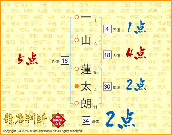 一(1画)山(3画) 蓮(15画)太(4画)朗(11画)