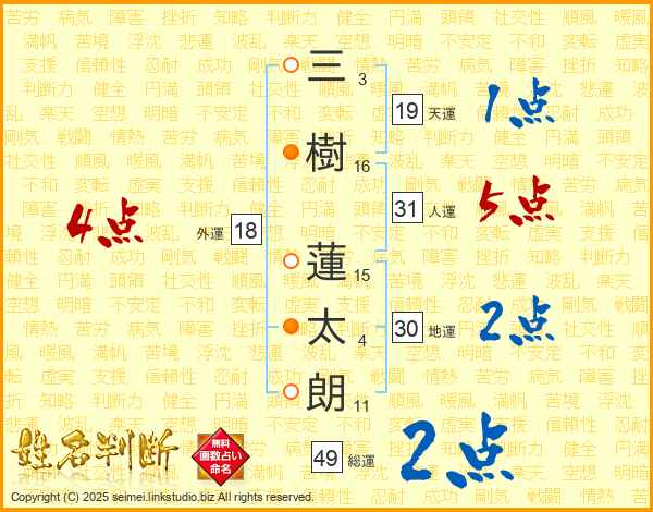 三(3画)樹(16画) 蓮(15画)太(4画)朗(11画)