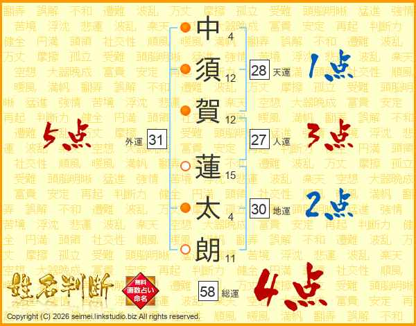 中(4画)須(12画)賀(12画) 蓮(15画)太(4画)朗(11画)
