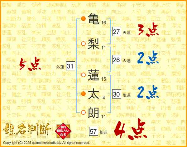 亀(16画)梨(11画) 蓮(15画)太(4画)朗(11画)