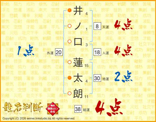 井(4画)ノ(1画)口(3画) 蓮(15画)太(4画)朗(11画)