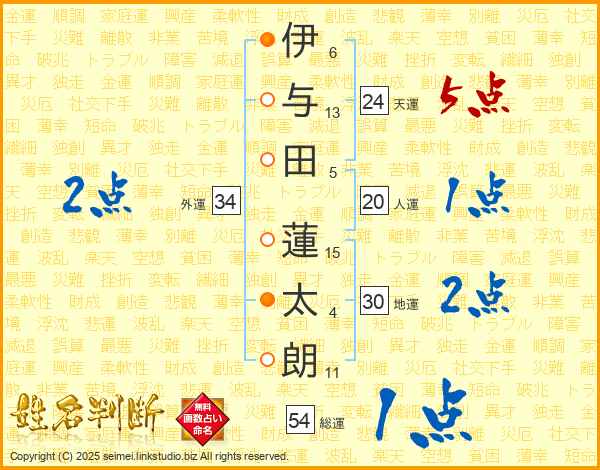 伊(6画)与(13画)田(5画) 蓮(15画)太(4画)朗(11画)