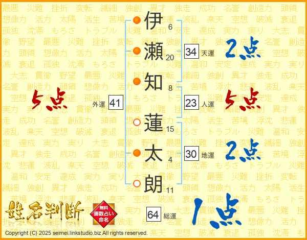 伊(6画)瀬(20画)知(8画) 蓮(15画)太(4画)朗(11画)