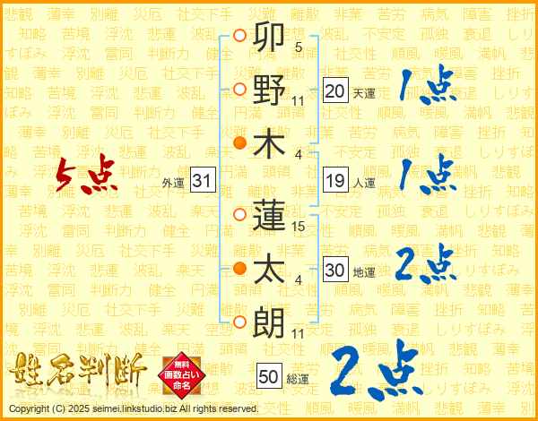 卯(5画)野(11画)木(4画) 蓮(15画)太(4画)朗(11画)
