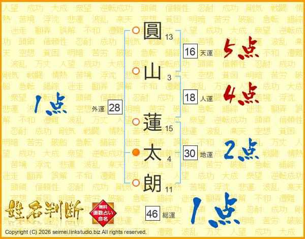 圓(13画)山(3画) 蓮(15画)太(4画)朗(11画)