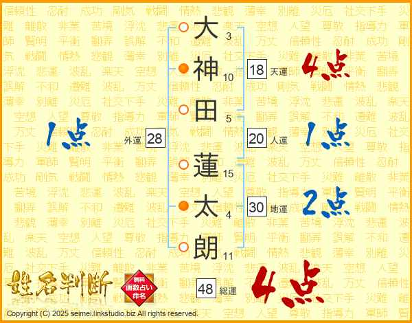 大(3画)神(10画)田(5画) 蓮(15画)太(4画)朗(11画)