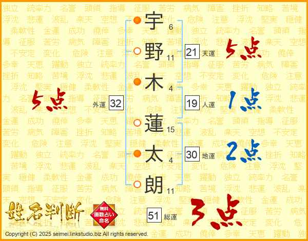 宇(6画)野(11画)木(4画) 蓮(15画)太(4画)朗(11画)