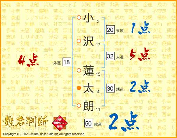小(3画)沢(17画) 蓮(15画)太(4画)朗(11画)