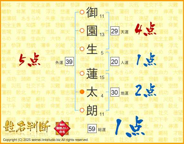 御(11画)園(13画)生(5画) 蓮(15画)太(4画)朗(11画)