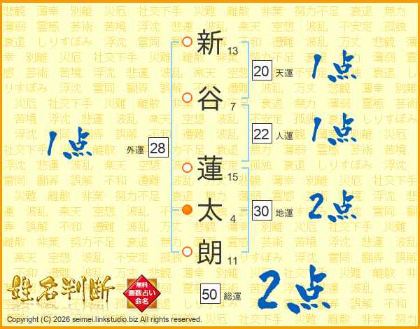 新(13画)谷(7画) 蓮(15画)太(4画)朗(11画)