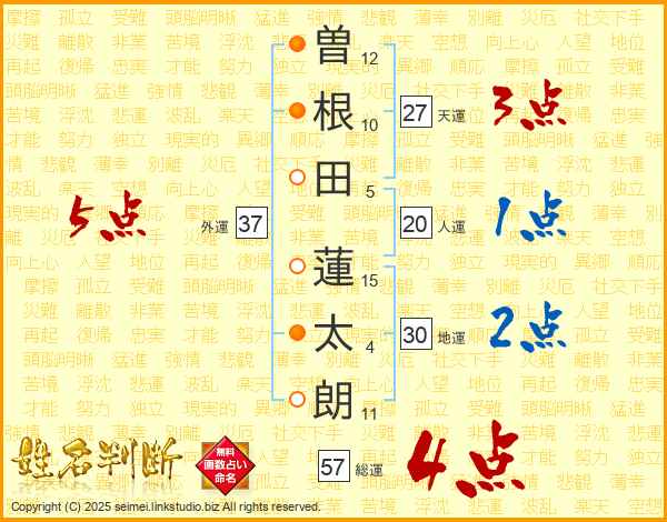 曽(12画)根(10画)田(5画) 蓮(15画)太(4画)朗(11画)