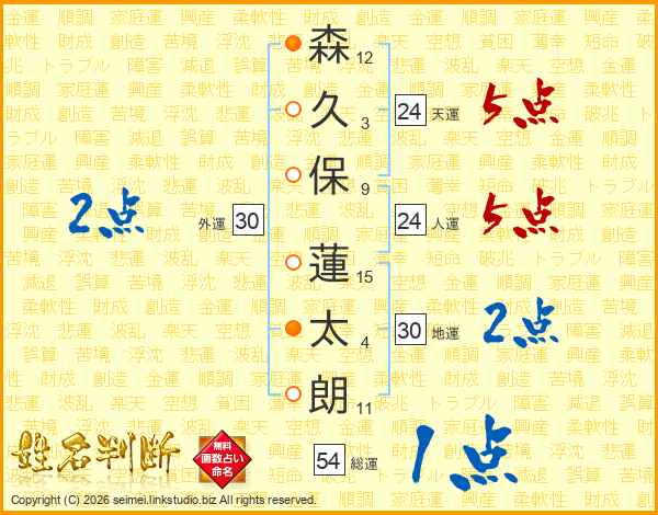 森(12画)久(3画)保(9画) 蓮(15画)太(4画)朗(11画)