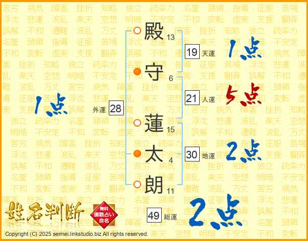 殿(13画)守(6画) 蓮(15画)太(4画)朗(11画)