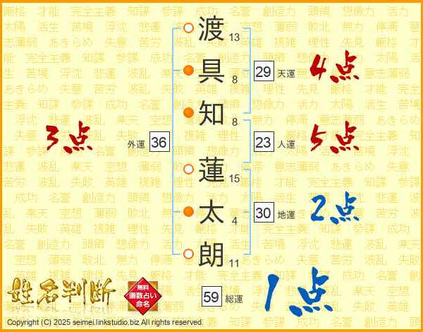 渡(13画)具(8画)知(8画) 蓮(15画)太(4画)朗(11画)